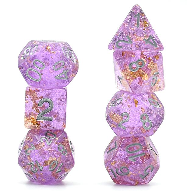Dobbelstenen Set Gold Foil Shimmer 7 delig. Kunststof, D4 / D6 / D8 / D10 / D10-00 / D12 / D20. Verpakt per 7 stuks assortie in een brick. HOT Games.